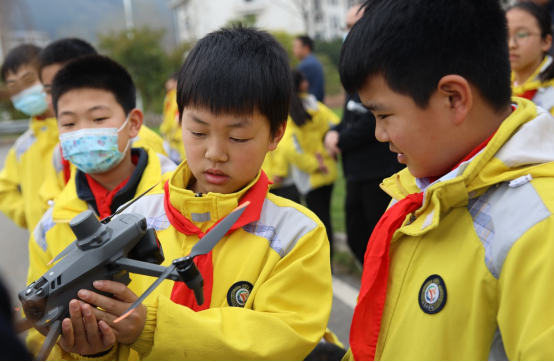 (孩子们好奇地研究监控无人机)