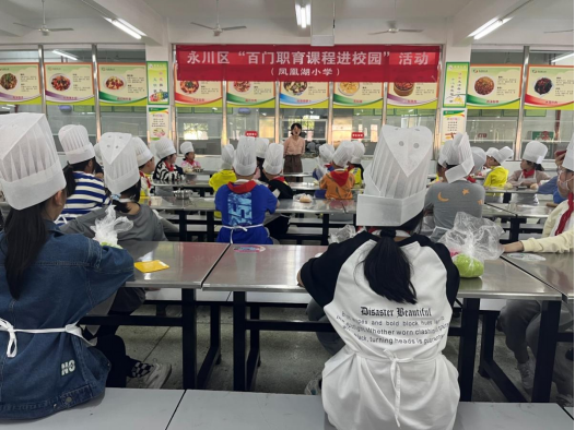 为进一步助力普通教育与职业教育相互融通,充分展示我校专业特色,4月11日下午,我校再度参加了永川区“百门职育课程进校园”教研活动,将《中式面点制作》课程带进凤凰湖小学。