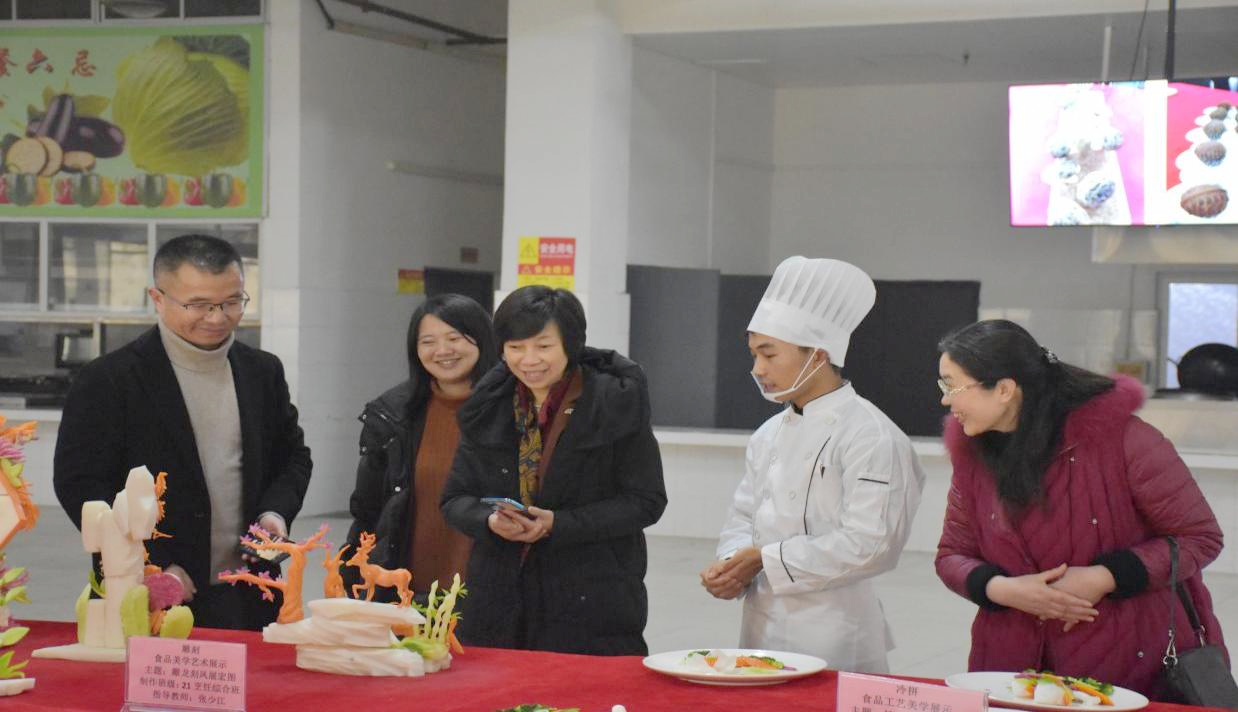 重庆市教科院职成所胡彦所长在刘永文副校长的陪同下参观了烹饪专业与酒店专业成果展示区,同学们用的精湛技艺做出的美味佳肴,赢得胡所长连连称赞。胡所长对我校学生职业技能实操水平高度肯定,期望学校持续以好老师、好课程和专业化的实训基地赋能人才培养培训,在各类职业技能大赛中取得佳绩。