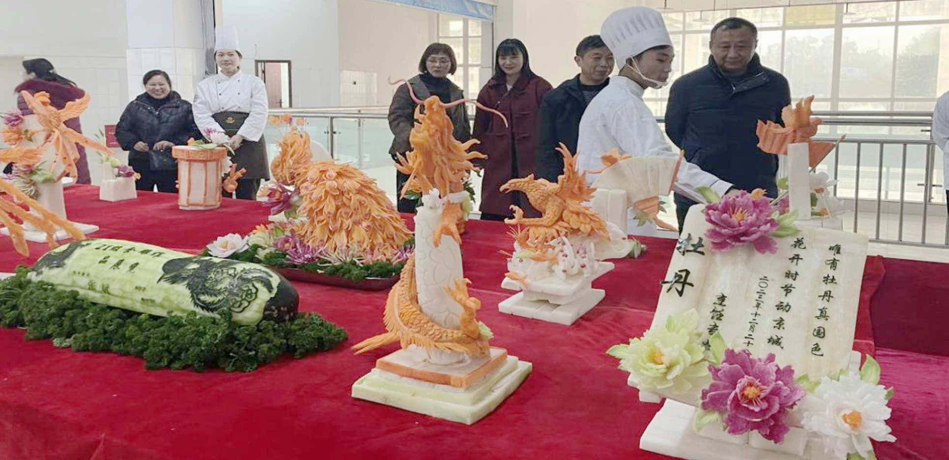 冷拼雕刻成果展示:飞龙在天、丹凤朝阳、鹰击长空等。