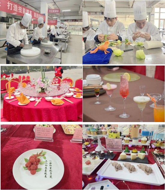 同学们各司其责、施展才艺,精心准备展示作品。转眼间,栩栩如生的冷拼雕刻,规范精美的餐厅摆台,时尚精致的各式调酒,美味新颖的烘焙甜品……通过同学们一双双灵巧的手呈现在大家的眼前。