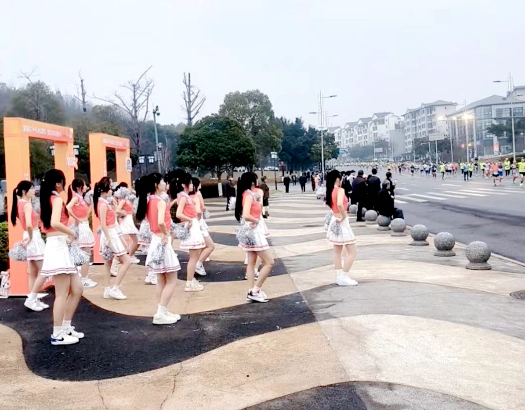 比赛当天,道路两旁彩旗飘扬,学生志愿者们早早来到跑道旁,他们身着统一的服装,精神饱满地分布在赛道沿线,每个人都带着灿烂的笑容,为选手们呐喊助威。其中,由20名女生组成的啦啦队成为现场一道靓丽的风景。她们手持彩带、标语牌等道具,伴随着动感的音乐,用青春活力的舞姿为选手们加油。呐喊声和欢呼声此起彼伏,现场气氛热烈,让参赛选手们感受到了巨大的鼓励和支持。