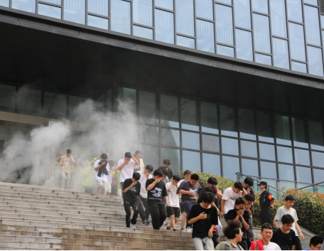 警戒人员观察到烟饼(模拟火情专用)冒出滚滚浓烟后,快速向总指挥报告,总指挥立即发出疏散信号,学生迅速行动起来,弯腰、低头、捂住口鼻,按照预先设定路线迅速而有序地撤离到“安全地带”运动场。